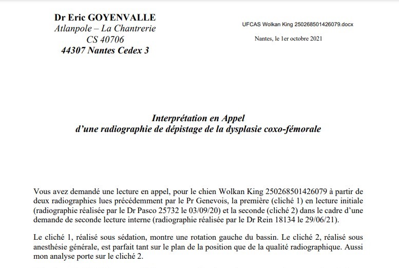 Dans un souci de clarté, et parce qu’un chien ne peut présenter plusieurs résultats dits officiels HD A/B/C, la commission d’élevage; comme la réglementation l’y autorise, a fait cette demande de procédure d’appel auprès du Dr Eric Goyenvalle, lecteur expert auprès de la FCI, afin de donner un classement définitif à ce chien, conformément au protocole. Cette expertise a été faite à partir du portail électronique où ont été déposées les radios par les vétérinaires les ayant effectuées. Seuls les vétérinaires et lecteurs ont accès à ce portail.