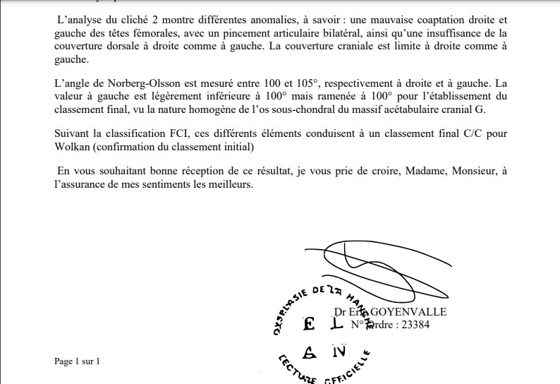 Malheureusement, d’après le Professeur Genevois, ce chien n’est pas mieux classé, voire inapte à la reproduction. Un courrier a été envoyé en date du 18/08/2021 pour en informer sa propriétaire. Malgré cela, deux autres demandes de lecture ont été envoyées par elle à des lecteurs différents, un en Allemagne, un en Belgique. Le chien y a été classé successivement HD B et HD A.