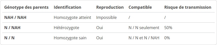 Les éleveurs affiliés à l’UCFAS s’engagent à faire tester l’un des deux reproducteurs avant tout accouplement pour le NAH, ou les deux reproducteurs si le premier testé ressort porteur sain, à partir du 1er Janvier 2021, afin d’éviter toute diffusion de la maladie.