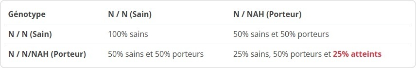 - « N/NAH» dit Hétérozygote pour la mutation du gène = PORTEUR : aucun risque d’avoir les symptômes du nanisme hypophysaire mais peut transmettre le gène à sa descendance.